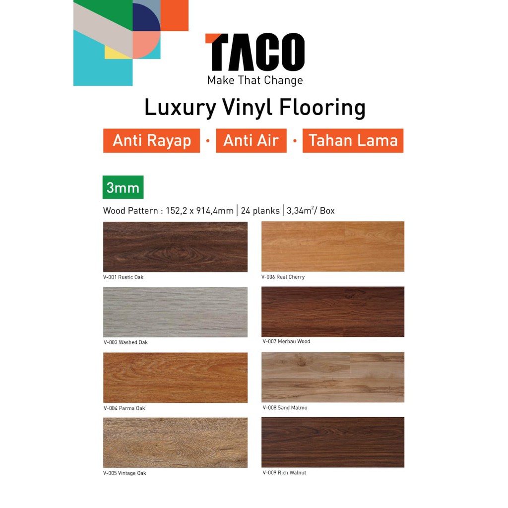 Selain memiliki harga jual yang terjangkau vinyl dan laminated juga memiliki banyak corak yang bisa anda. Lantai vinyl taco tebal 3 mmrp494 000. Vinyl taco flooring luxury planks woodgrainrp510 000. Permukaan embossed adalah jenis permukaan vinyl yang bertekstur seperti urat kayu sungguhan yang menjaga lantai vinyl agar tidak licin.